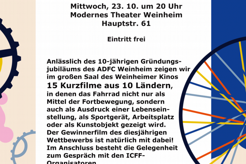 Anlässlich des 10-jährigen Gründungsjubiläums des ADFC Weinheim zeigen wir im großen Saal des Weinheimer Kinos ein von den Organisatoren des ICFF ausgewähltes Programm von 15 Kurzfilmen aus 10 Ländern